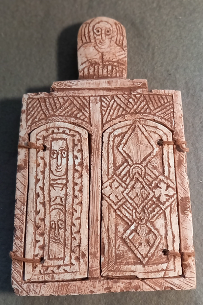 This is a triptych with religious scenes carved in relatively soft stone from the Axum area. Coptic crosses and various saints are depicted in the white stone.