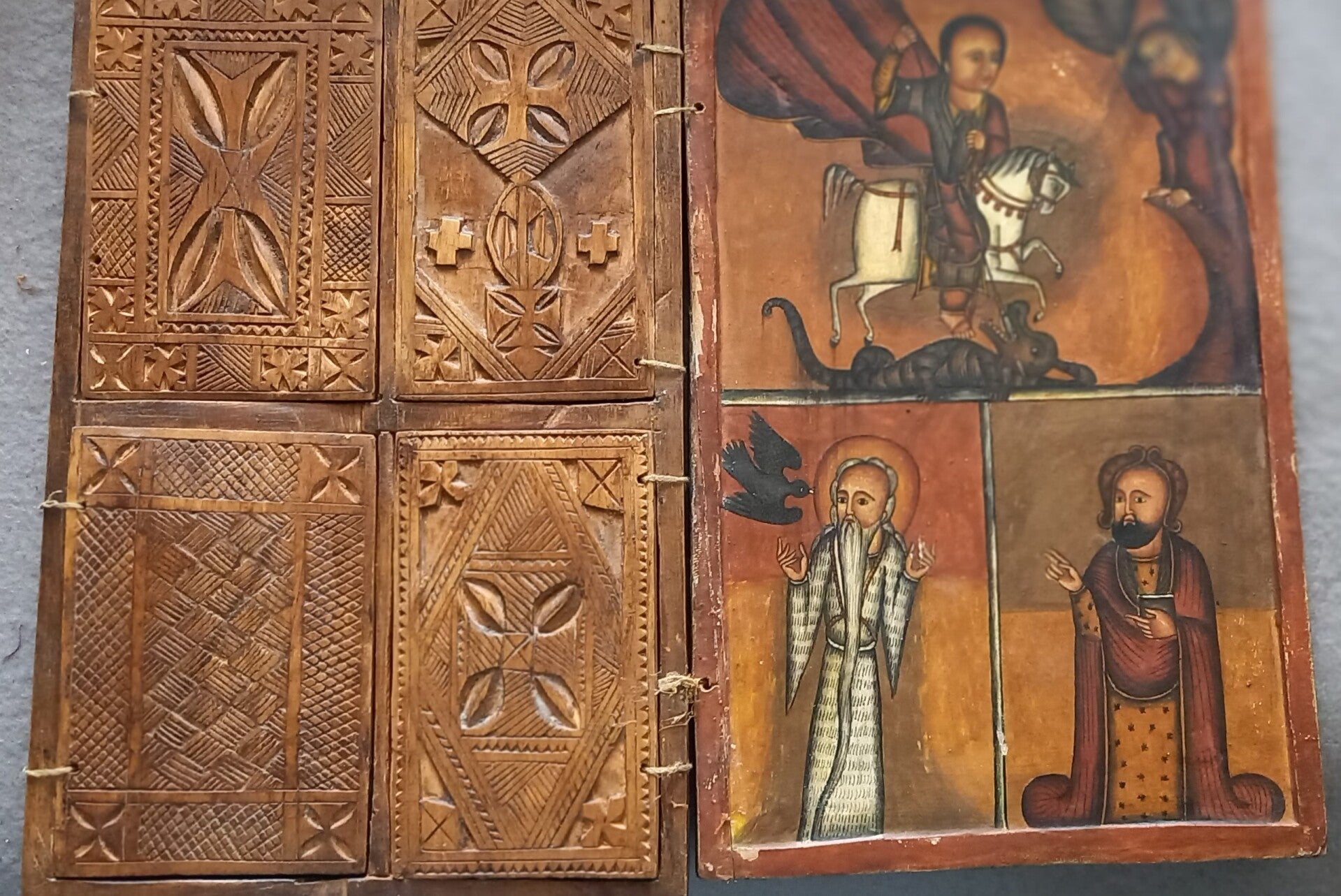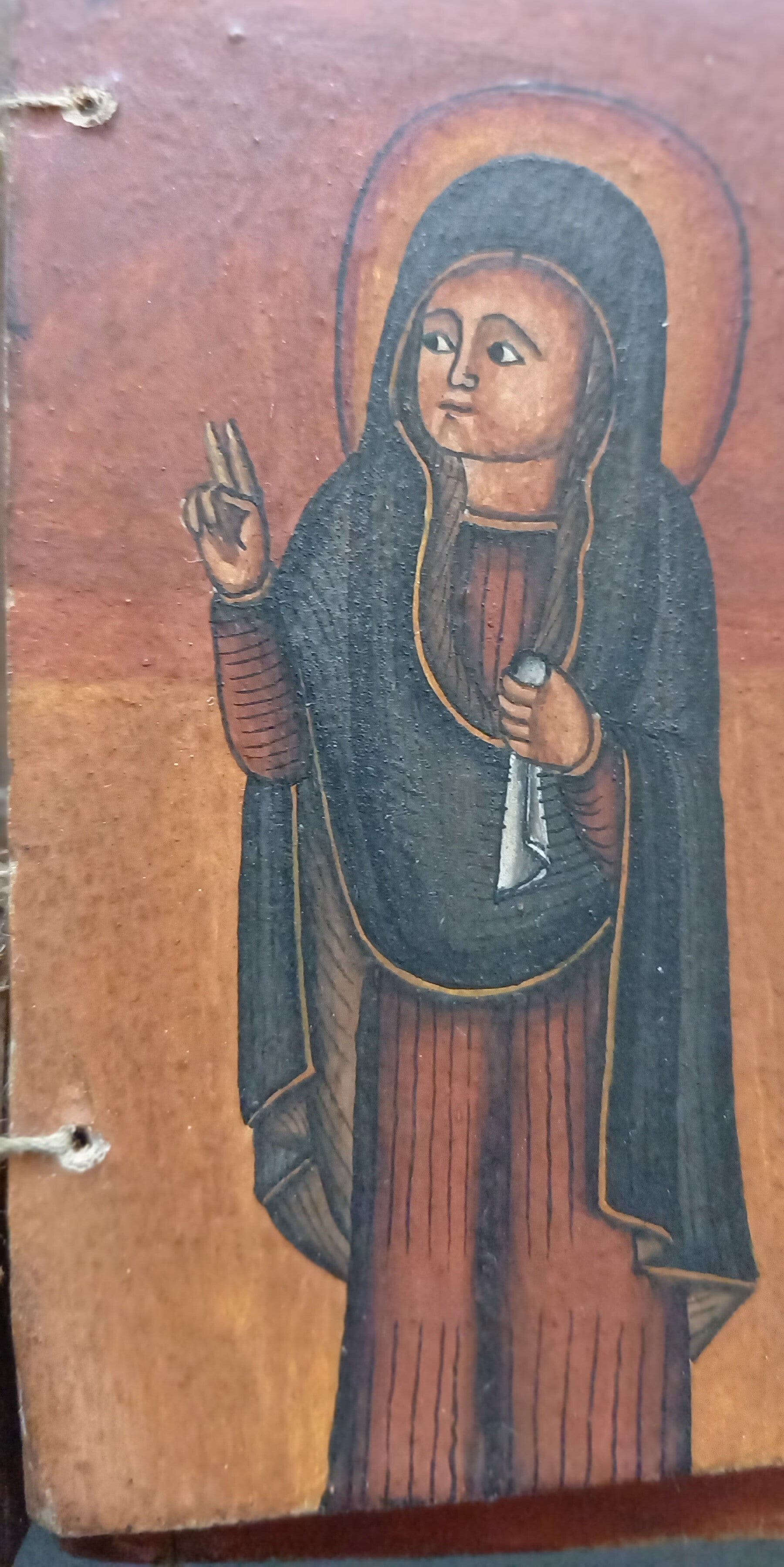 Deze icoon is aan de buitenzijde bewerkt in het hout met voorstellingen