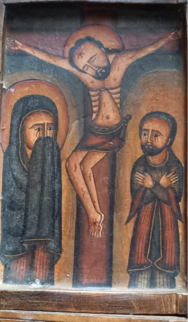 vaste binnen paneel staan Christus aan het kruis en Maria met kind.